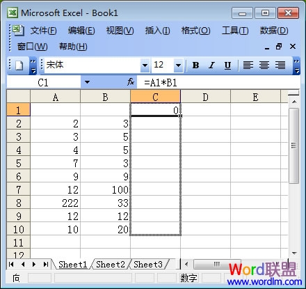 步骤一、鼠标点选到C1的单元格中,然后输入公式“=A1*B1”;如图