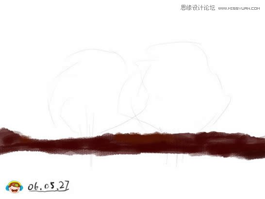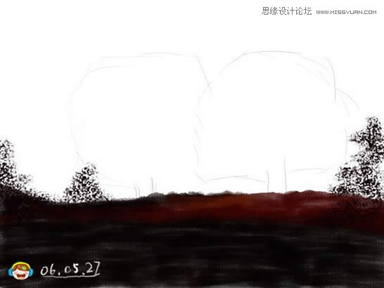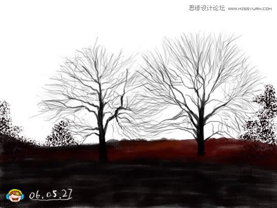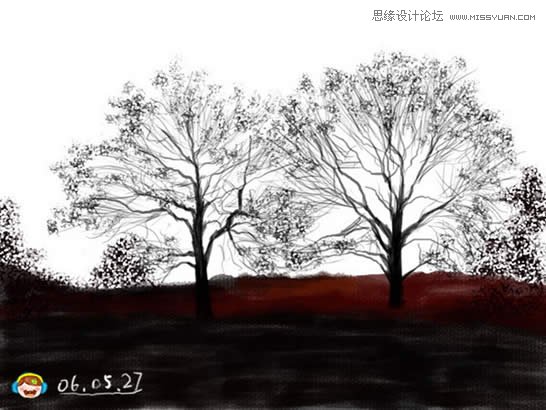 4、画出画面中的树,在顶部建立新层,使用圆头柔边画笔,画的时候随时更改其大小,使用钢笔压力。 |