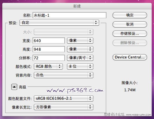 | 2、在PS中新建一个640X948像素的画布。 |
