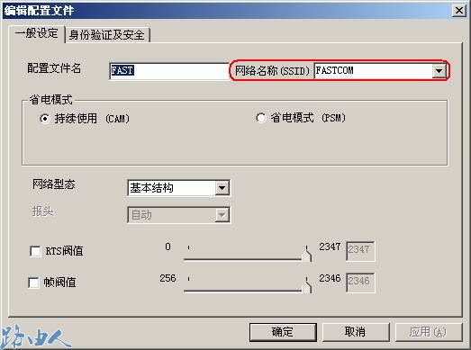 (1)打开FW54U客户端应用程序主界面——配置文件—>编辑,会弹出用户配置文件管理对话框,在常规页填入和无线路由器端相同的SSID ——本例FASTCOM”,如图示