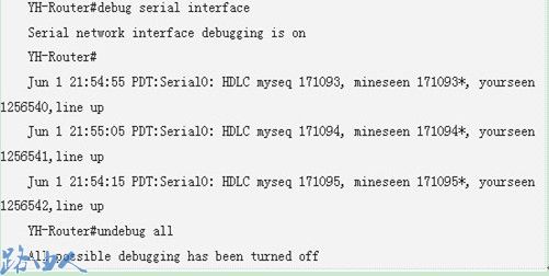 debug serial interface命令是直接与思科路由器接口和传输介质类型相关的调试命令。在下面的示例中,串行接口采用HDLC封装。端到端的HDLC保持活跃的报文每10秒钟交换一次。这表明链路操作正常并且第二层工作正常。show interface serial0命令表明线路协议正常启动。使用 undebug all命令关闭所有的调试。