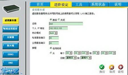 二、调试宽带路由器虚拟服务器功能。 进入到路由器的“进阶设定”,然后选择“虚拟服务器”。填入Web服务器的相关参数,然后执行。虚拟服务器功能默认的设置是关闭的,需要激活此功能。