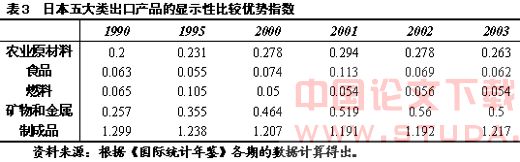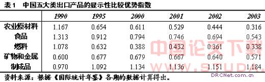 根据公式(1)和《国际统计年鉴》的分类数据,我们计算出了中国五大类出口产品在不同时期的显示性比较优势指数(见表1)。