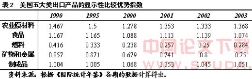 表2显示,美国的五大类出口产品中,只有制成品的RCA值在考察期间内略有上升;而其他4类产品的RCA值均出现不同程度的下降。从美国各类出口产品的RCA数值来看,农业原材料、食品和制成品的RCA值在整个考察期间内均大于1,表明这三类产品始终具有比较优势;其中,农业原材料的比较优势最强。而燃料、矿物和金属的RCA值在整个考察期间内均小于1,表明这两类产品始终具有比较劣势,其中,燃料的比较劣势最明显。