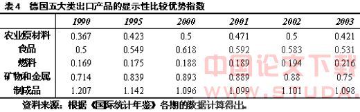 表4显示,德国的五大类出口产品中,只有制成品的RCA值在整个考察期间内呈现下降态势,其他4类产品的RCA值均呈现不同程度的上升态势。从德国各类产品的RCA数值来看,只有制成品的RCA值在整个考察期间内均大于1,表明制成品始终具有比较优势;而其他4类产品的RCA值在整个考察期间内均小于1,表明这4类产品始终具有比较劣势,其中,燃料的比较劣势最明显。
