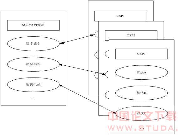 像JAVA中的JCA/JCE一样,MS-CAPI隐藏了密码算法本身的一些繁琐内容,而仅体现出功能上的要求。MS-CAPI同样使用了引擎和类的方式,但它有自己的术语描述方法。在MS-CAPI中,提供者类等同于我们常说的CSP(Cryptographic Service Providers)。不同的厂家提供的CSP在内部实现代码上可能不尽相同,但是在对外接口上按照微软的定义都是完全一样的。MS-CAPI提供一套通用的但需要CSP支持的外包接口,应用程序开发者通过使用这套接口来实现密码安全功能。CSP的内部内容对于应用程序的开发者来说是透明的。MS-CAPI自带默认的微软CSP,这个CSP也可被其它第三方的CSP所替代。