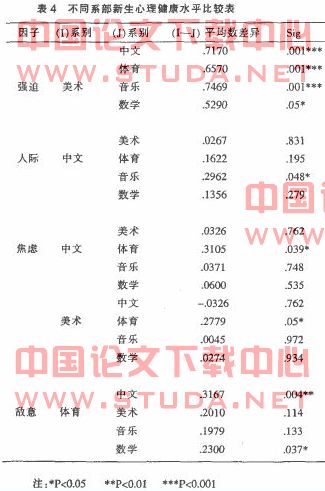 由表4可知:在强迫因子上.美术系得分显著高于其他各系,其他各系之间无显著差异。在人际敏感因子上,中文系显著高于音乐系,其他各系无差异。在焦虑方面,中文系和美术系显著高于体育系,其他各系无显著差异。在敌意方面,体育系高于中文系和数学系,其他各系无显著差异。