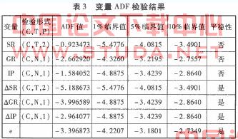 然后,采用ADF方法对各变量进行单整检验,得到的结果见表3。从表3可以看出,GR、SR、IP的检验统计值大于临界值,说明它们是非平稳序列。而它们的差分序列AGR和ASR以95%的置信度通过检验,AIP以90%的置信度通过检验,说明AGR、ASR、AIP为平稳序列。显然,可以判定GR、SR、IP各变量都是一阶单整的,即I(1)序列。