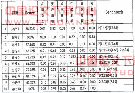 将上述各家分行的投入、产出的数据输入Matlab6.5软件(Mat1ab软件是由Mathw0rkS公司用C语言编写的著名的工程数学应用软件,具有强大的矩阵运算能力和方便、直观的编程功能),经过计算机处理后.计算结果如下