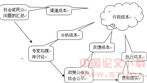 从图中,我们可以看到政府的决策制订大致分为四个阶段,犹如一条作业成本链贯穿始终,它清楚地向我们展示了每个阶段成本的来源,也就是政府在为社会创造隐性价值的价值链。