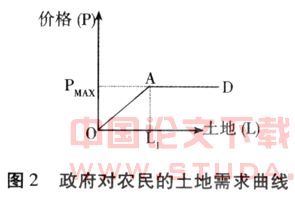 农民的土地供给是这样的,那么政府对土地的需求曲线是什么样的呢?从上面农民对政府的土地供给曲线的分析中不难看出,农民的供给基本上是受制于政府。从某种意义上讲,是政府按照自己的意愿“制造”了农民的供给曲线,所以说农民的供给曲线就等于政府的需求曲线 (如图2所示)。那么为什么会出现OA部分需求曲线向上倾斜的情况呢?是因为政府的土地需求是根据市场需求转而向农民的需求,所以当面对市场需求时,这一政府对农民的需求曲线就变成市场供给曲线。所以就出现了虽然价格上升但需求(实际上是政府为了满足市场的需求而增加的供给)也上升的情况。