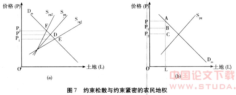 图7(a)表明了“约束松散的农民地权”导致土地资源浪费的情况。由政府和农民组成的供给曲线Spg由于上述的原因而趋于平缓,弹性增大,由Spg向下移至Spg1,形成新的供给曲线。表明土地市场上局部均衡点下移,由D移至正点。均衡价格从P下降至P1,从而限制了土地价值最大化,造成了土地资源的浪费。图7(b)则表明厂“约束松散的农民地权”导致土地资源浪费的具体过程。对于土地L,当农民以P1的价格出让土地时,其市场价格为P,而PABP1就是由农民对自已所拥有的地权部分处置不当造成的损失;同样,政府中实际操作者利用手中的部分地权而定的价格为P2,市场价格为P,PACP2就是政府对自己所拥有的地权部分处置不当造成的;当政府将土地定价为P1时,农民定价为P2,如果最后选择的价格为P2,则是农民“侵蚀”了政府的地权,会多增加损失P1BCP2;相反,如果农民将土地定价为P1时,政府定价为P2,如果最后选择的价格为P2,则是政府“侵蚀”了农民的地权,会多增加损失P1BCP2。可见,由于农民与政府自身对地权把握失度及二者相互侵权导致了土地资源的浪费。而这一切的发生均是由于地权分割后对地权不同部分所有者的约束不当造成的。