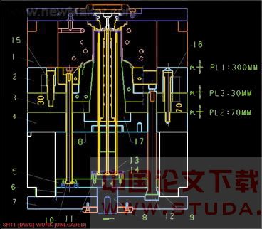 动作原理:顶辊镶件3固定在上面顶针托板上,顶出时四块板一起动作。由上面的顶针顶出流道。装在下面顶针板上的顶针滞后,当垫块5碰到顶针,第二次顶出才把产品顶离模肉。