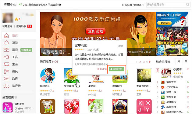 将鼠标放在要添加的应用游戏‘空中花园’上,会弹出对话框,根据页面提示点击‘添加应用’即可。